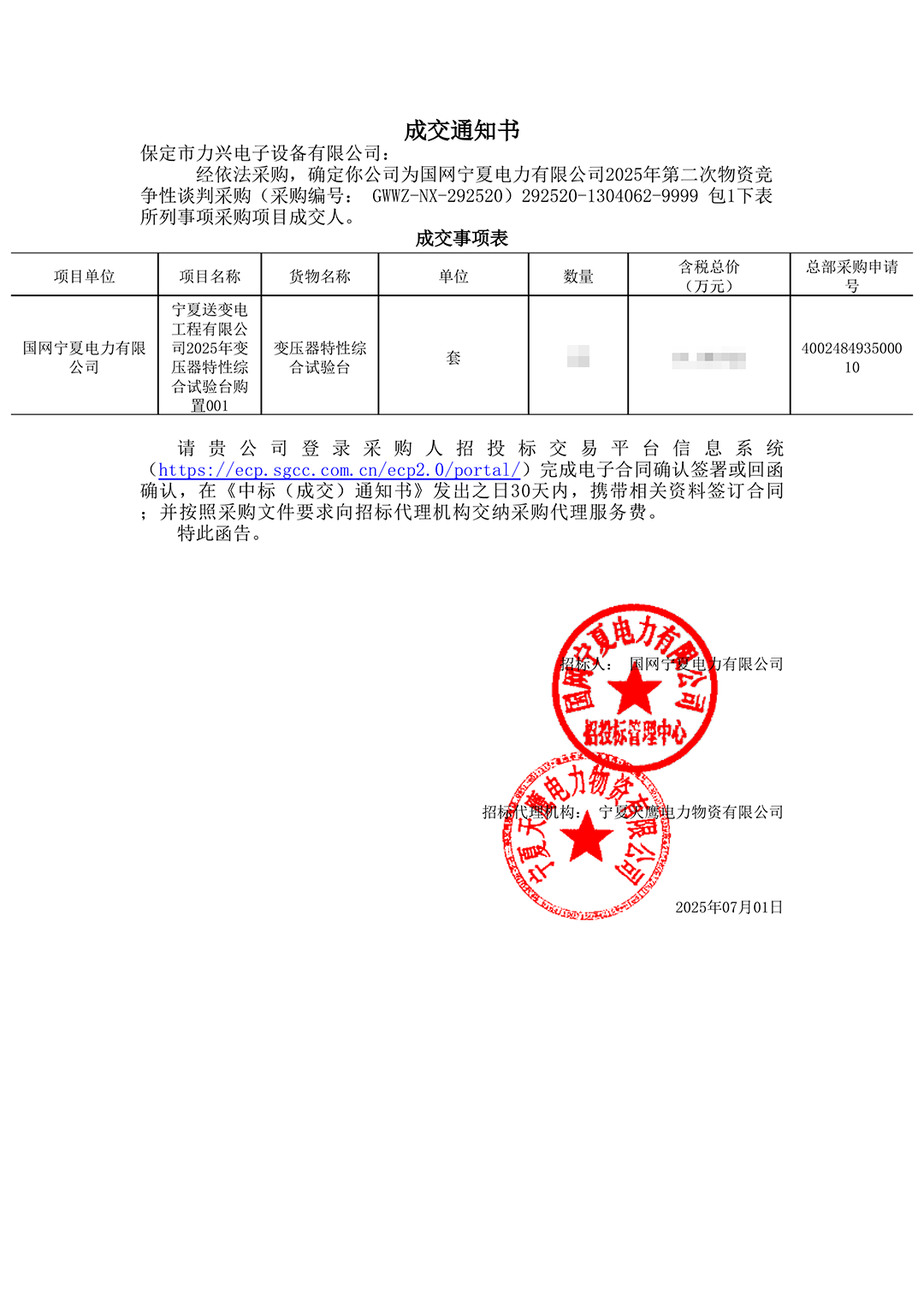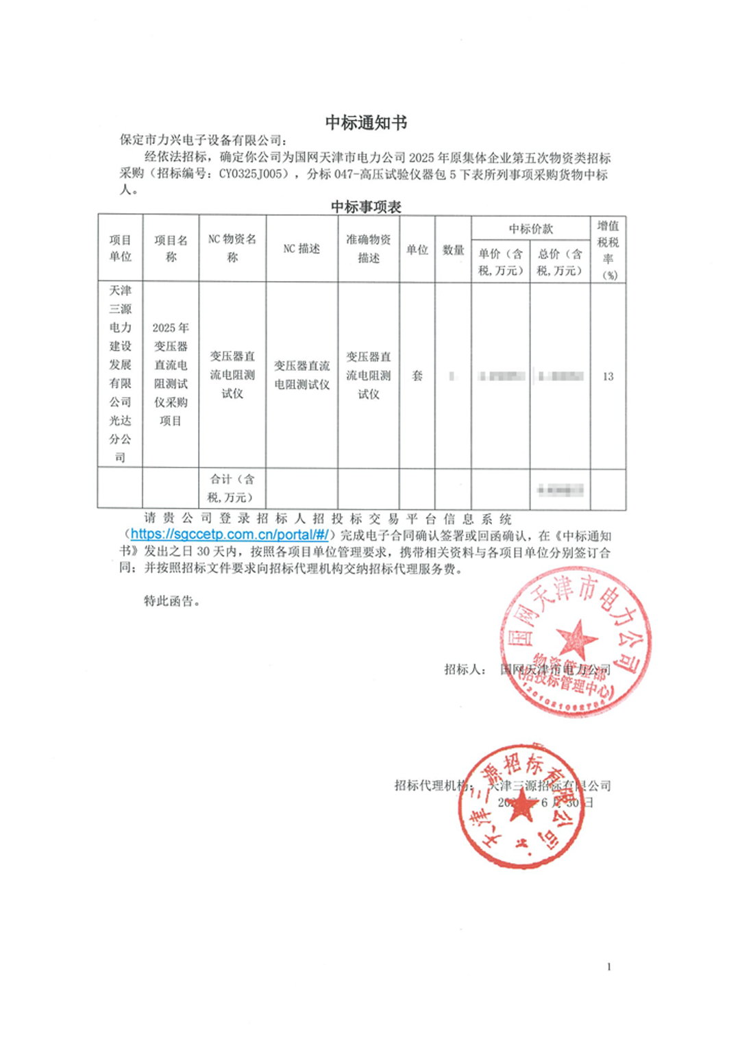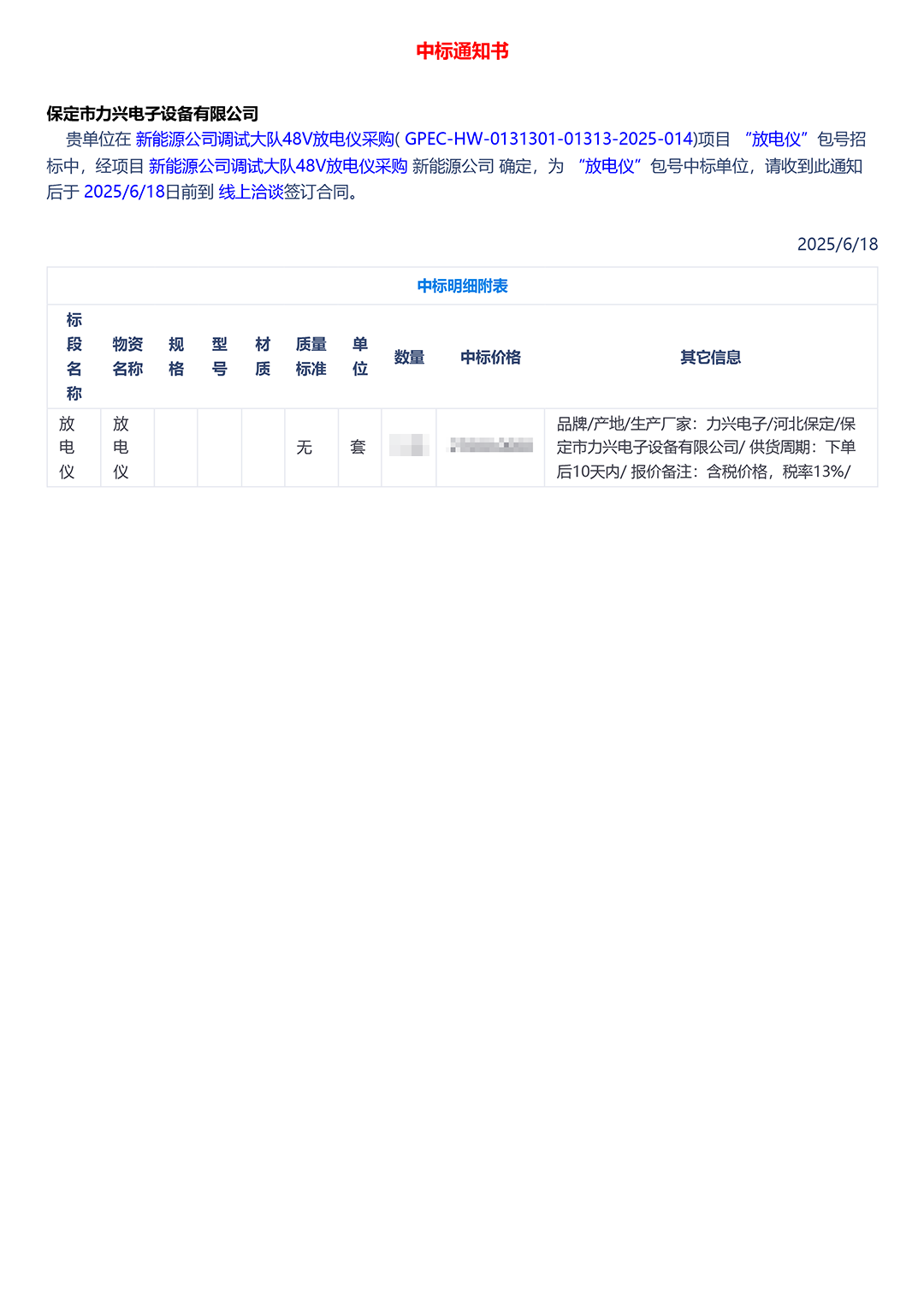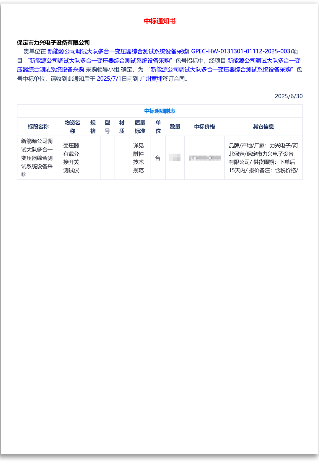 保定市力兴电子设备有限公司第二季度中标通知如下展示,我们将团结一致,再接再厉,迎接已经到来的第三季度。
